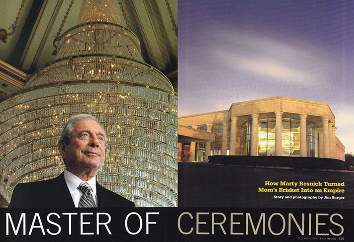The Martins catering kingdom stretches across Maryland, from the verdant fields of Frederick County to the bustling suburbs of our nation's capital. Its holdings include a mansion in Hunt Valley, a palace in Upper Marlboro aptly named Camelot, and a Greek revivalist temple towering over the Baltimore Beltway—with a giant billboard as familiar and iconic as the Shot Tower or the Aquarium—seven facilities in all. It is an empire built from honey-glazed ham and pit beef, set upon pilings of three-bean salad and coleslaw. If catering had royalty, its king would be Martins founder Martin Resnick. But you can call him Marty.