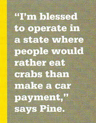 Two of the people served are food brokers Jim Pine and Corynne Courpas, who sit together at a table, sipping wine. They are guests of the Resnicks, who often purchase a table at events held at the site. It's a perk for keeping the stockroom shelves filled. They extol the virtues of their benefactors. For 20 years, Pine has owned Steamin' Demons, a strictly carryout crab house in Middle River. He recalls the day in 1987 that Wayne Resnick walked into his place, and with a handshake—they've never had a contract—invited him to be one of only two suppliers of steamed crabs for Martins numerous crab feasts. He grows wistful thinking of the passage of time in service to the Resnicks. "Martins transcends my bachelor days, my married days, and the births of my children." But underlying the business aspect is fierce devotion to the client, "When crabs get scarce, I close down the carryout so I have enough for Martins. I don't want to be put in a position where I disappoint Marty Resnick." It's also a good career move—he'll steam anywhere from 1,000 to 7,500 crabs at a feast. "I'm blessed to operate in a state where people would rather eat crabs than make a car payment," Pine says with a laugh.