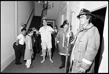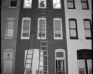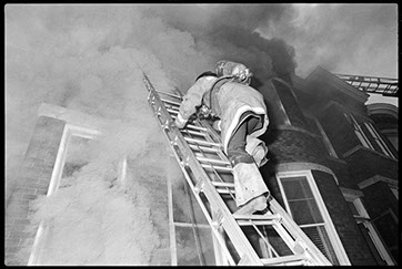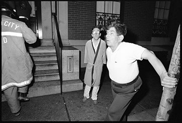 1981 BCFD, Engine 1 Firefighter Joe Machovec and Captain Fred Rafferty crawl into burning building, Bolton Hill
